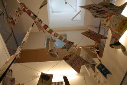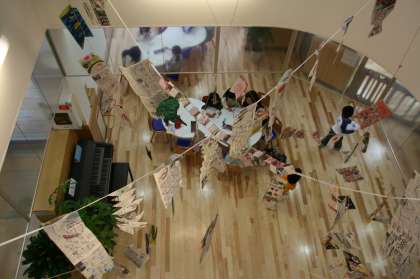 子どもの日に向けて手づくりのこいのぼりをつくり、吹き抜けにかざりました。
